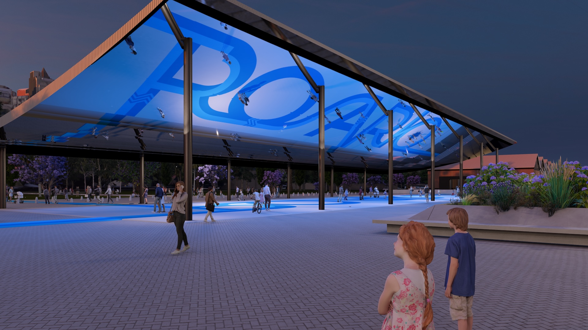 Entre los galpones 13 y 15 se instala El Aura, una cubierta reflectante que redefine la imagen del sector. El dispositivo genera un espacio público semicubierto preparado para actividades culturales, recreativas y encuentros ciudadanos.